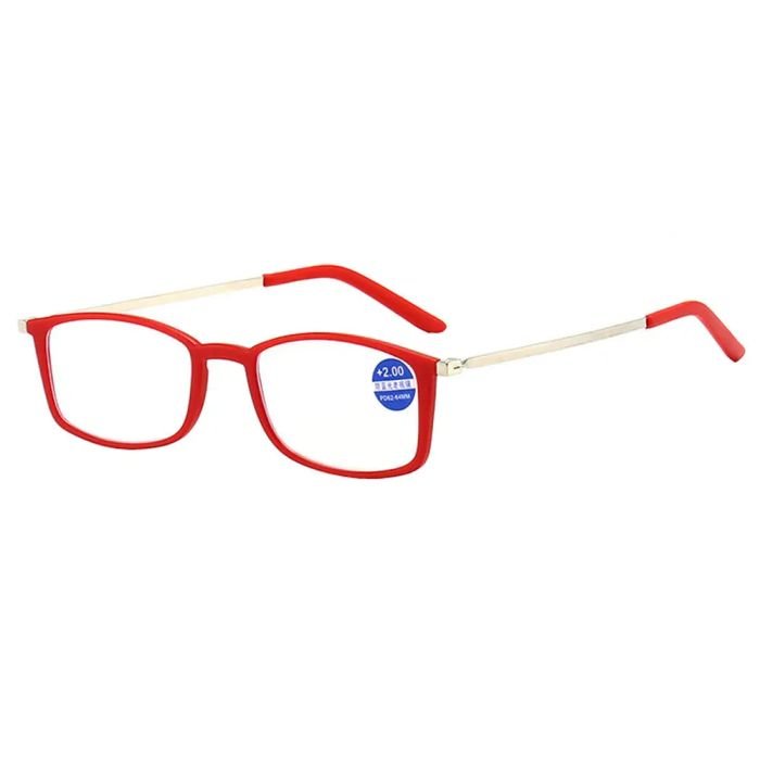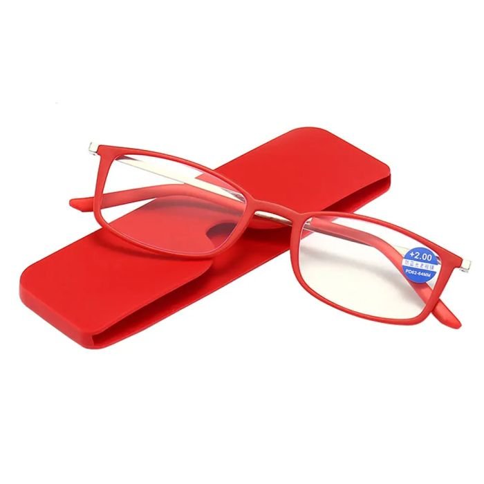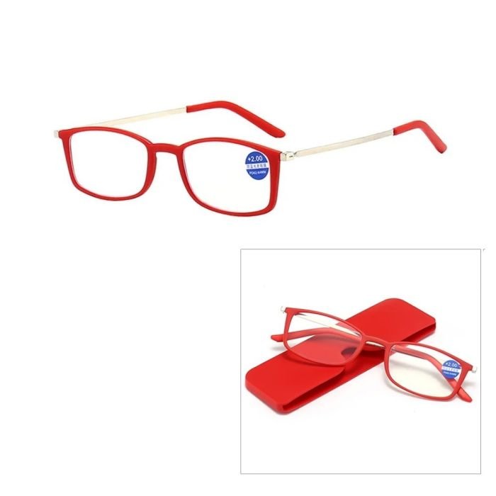 These glasses are perfect for enhancing vision while reading, with a magnification power of up to +3, making small text easier to read. The stylish red design is suitable for both men and women, and they come with a practical case for protection on the go. Lightweight and comfortable for extended wear, these glasses provide a convenient reading experience at home or while traveling